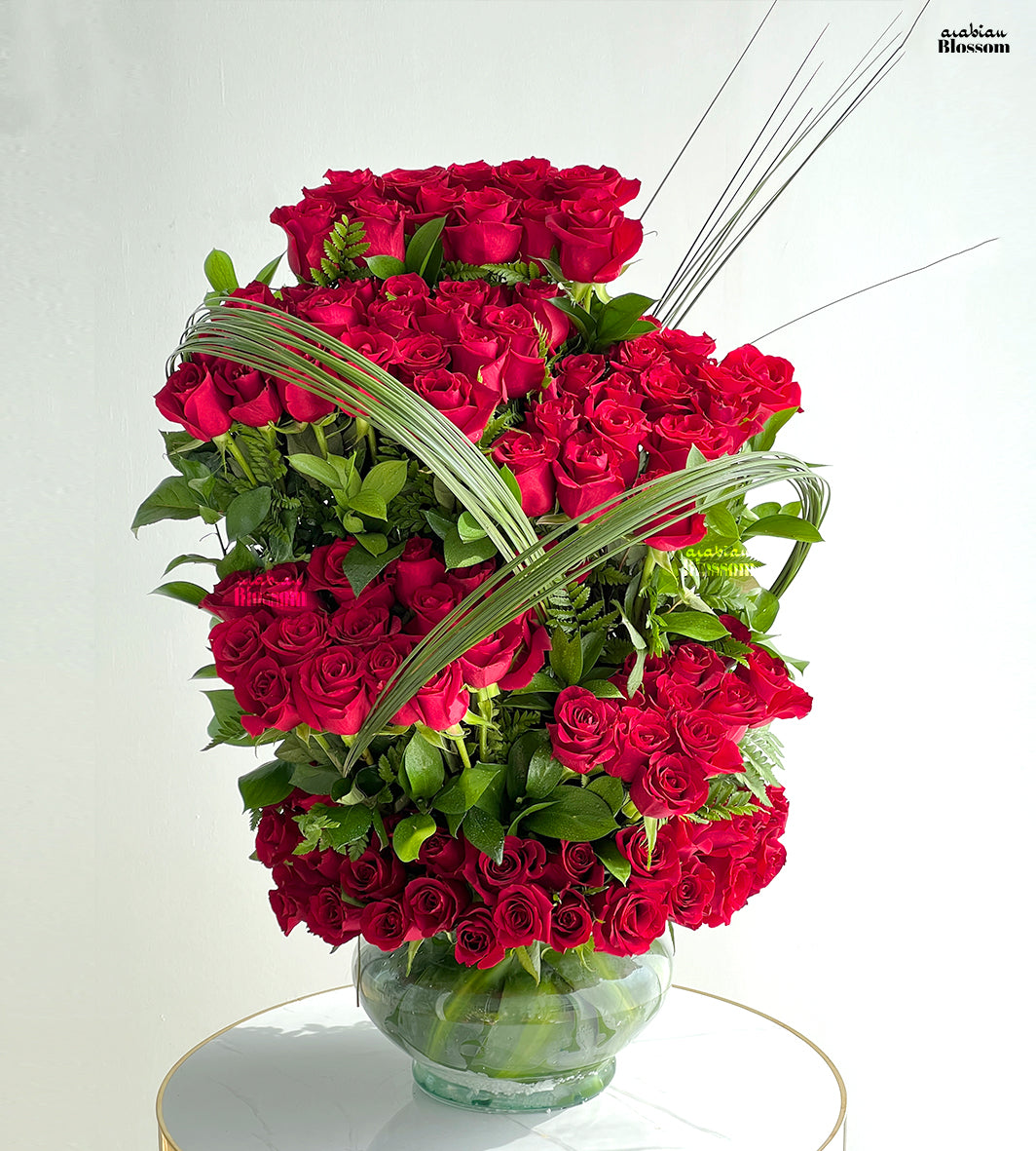 - Arrangement of 100 stems of red roses beautifully arranged in a base of the fish bowl