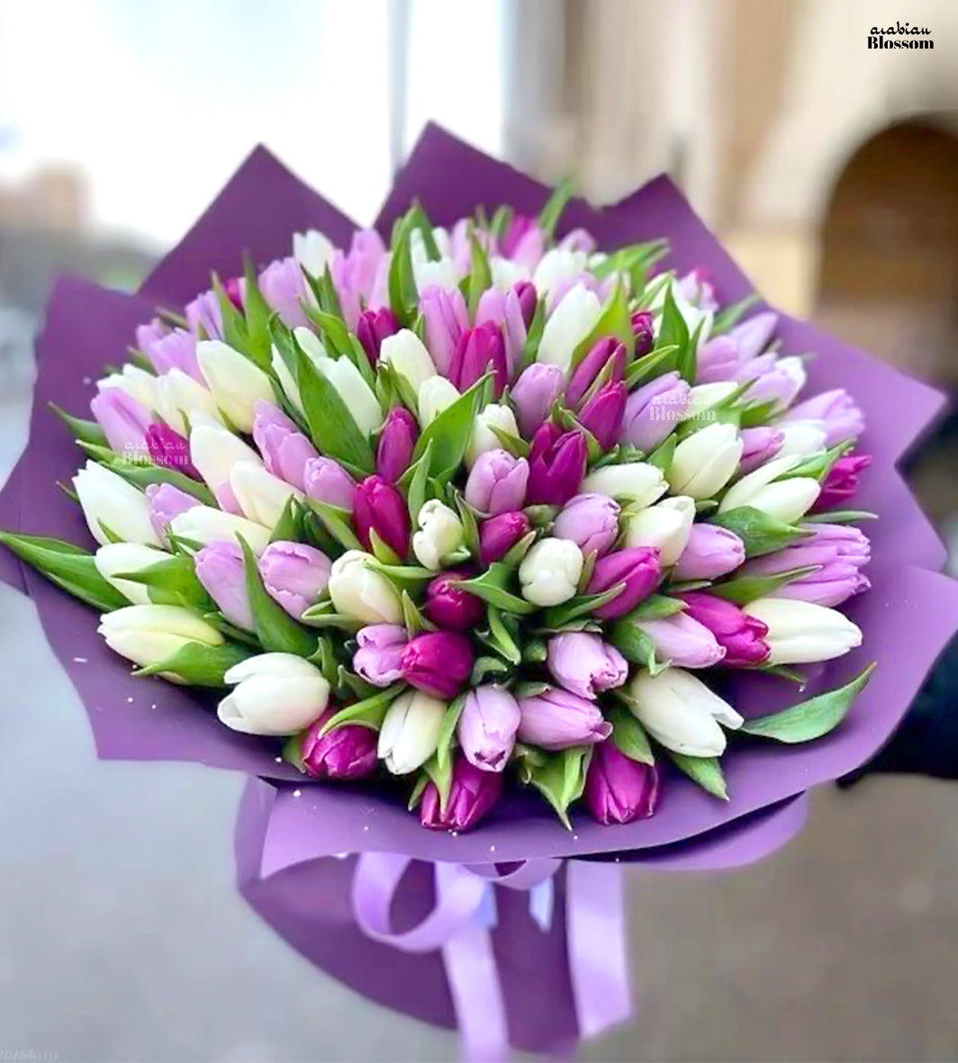 A bouquet of 101 stems of Mix Tulips in a nice Purple Wrapping