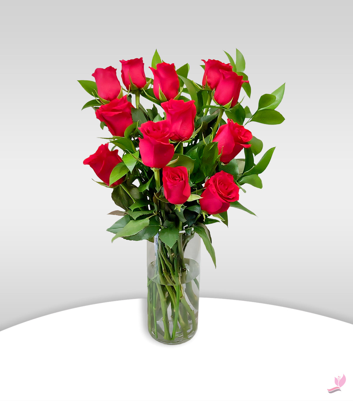 12 Red Roses with Ruscus Fillers in Glass Vase for Elegant Gifting & Décor
