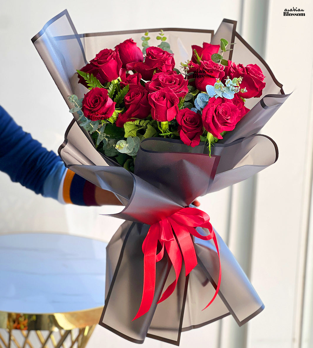 Bouquet of 15 stems of red roses with fillers of ecualyptus in a nice black wrapping