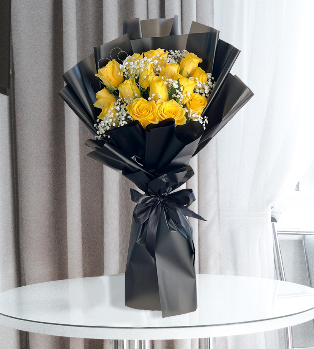 - Bouquet of 15 stems of yellow roses with fillers of gypsophila in a nice black wrapping