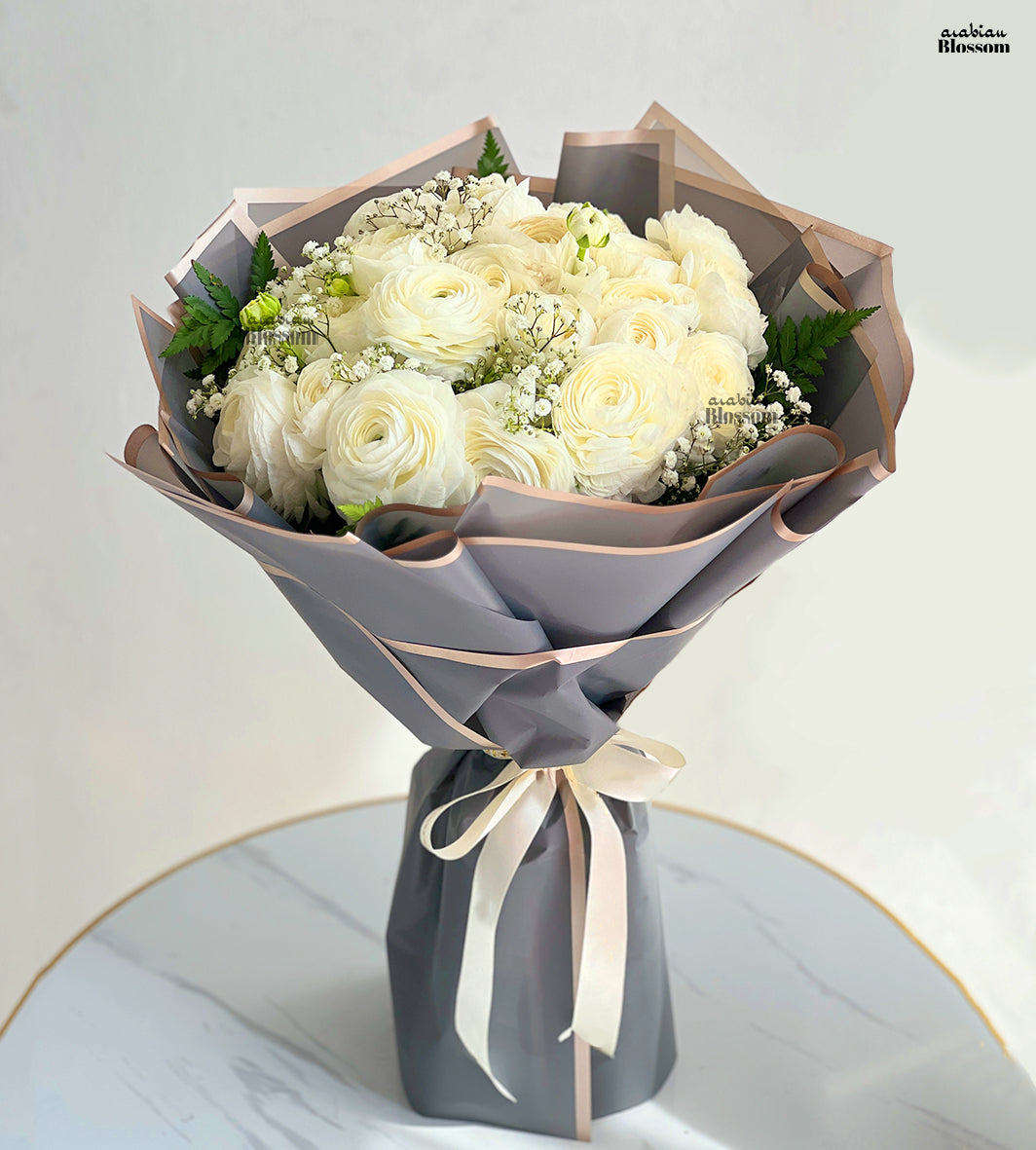 Bunch of 20 stems of white Ranunculus with fillers of gypsophila in a nice wrappingÂ