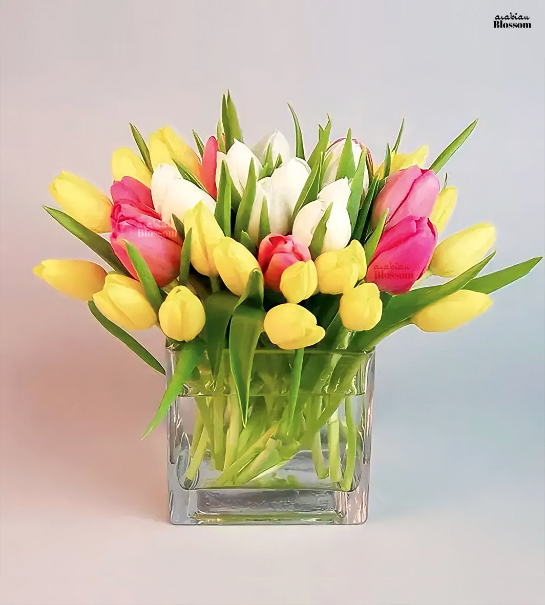 20 Yellow, 10 White & 10 Dark Pink Tulips in Glass Vase for Weddings & Décor