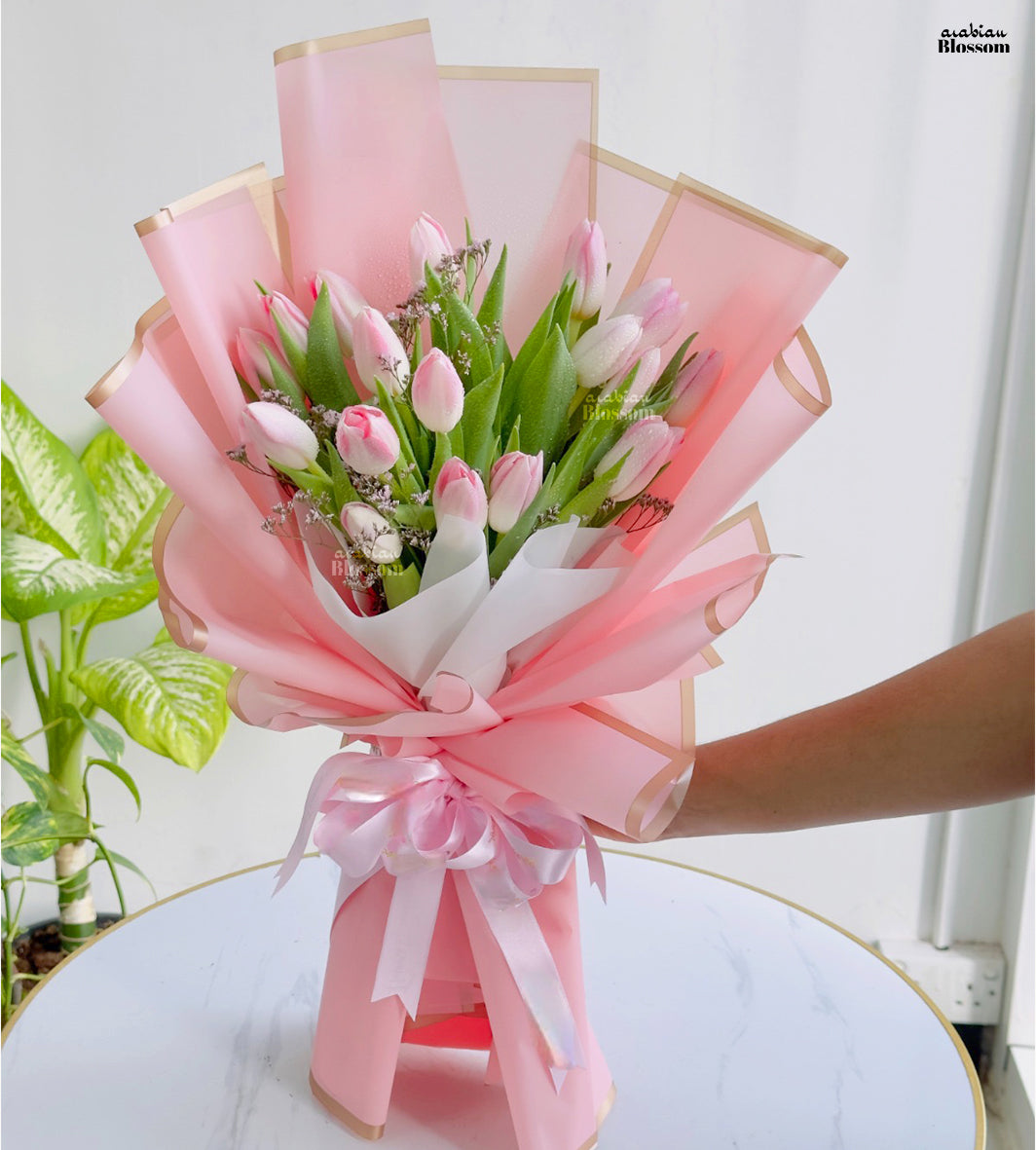 A Bouquet of 21 stems of Pink Tulips with fillers in a nice Pink Wrapping