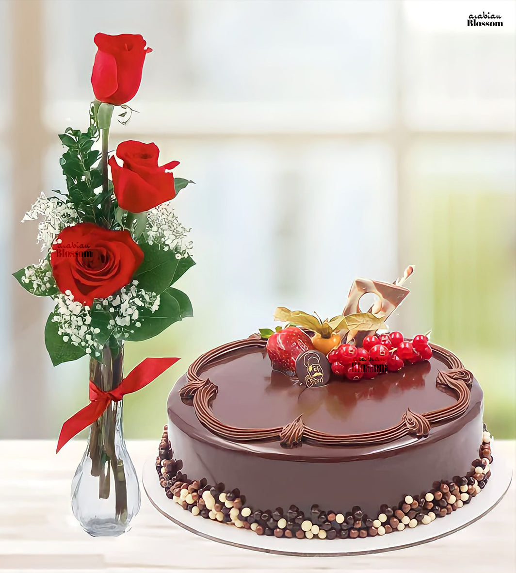 3 stems of red roses with fillers in a glass vase with 1kg chocolate cake