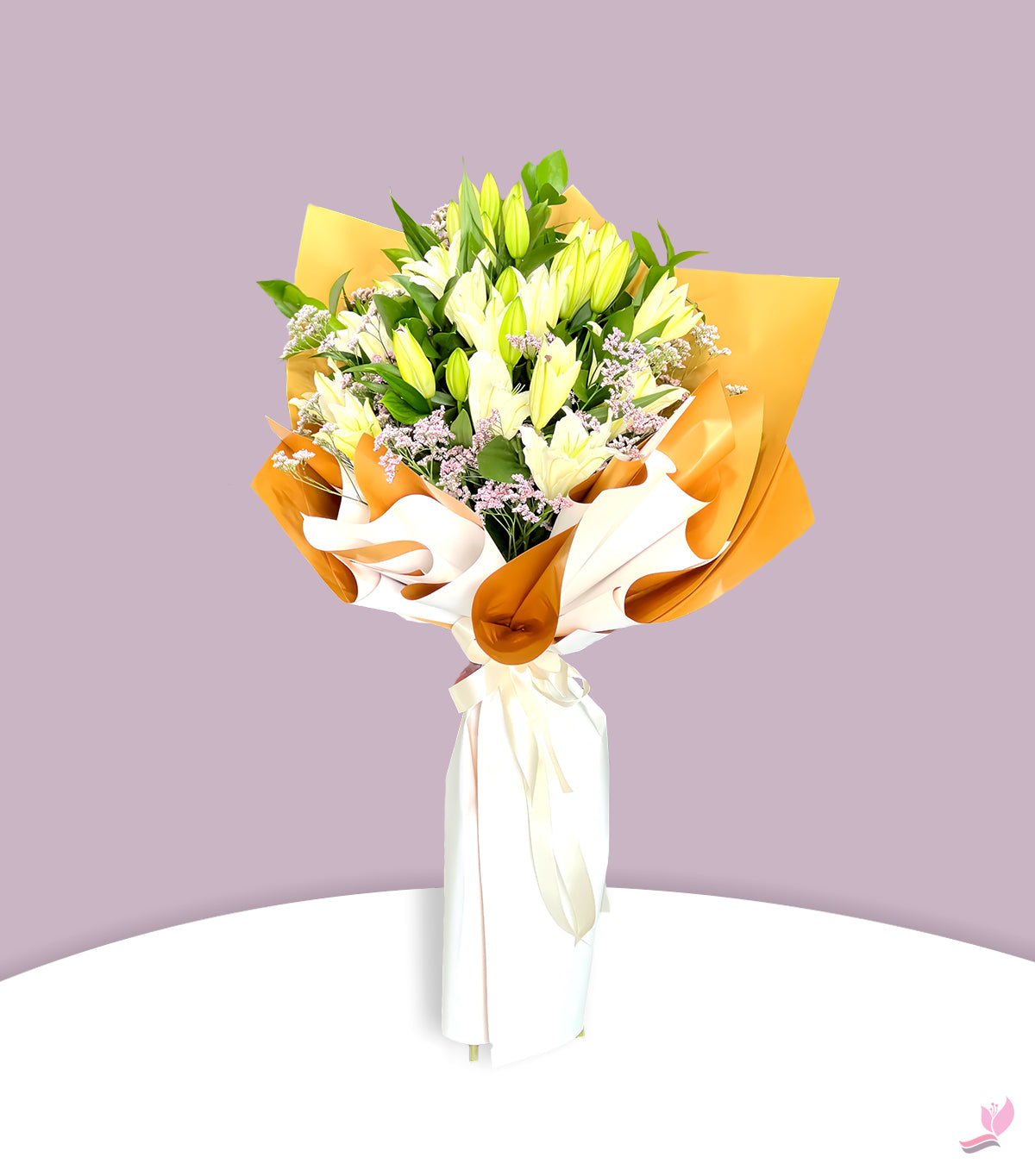 Bouquet of 5 stems of White lilies in a nice wrapping with fillers