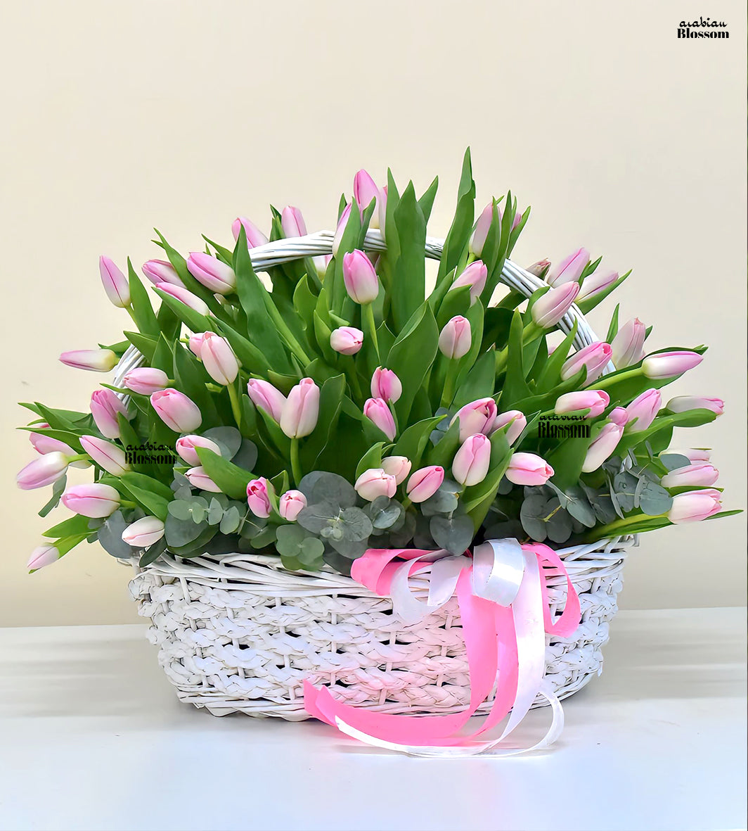 Arrangement of 50 stems of pink tulips with fillers in a white basket