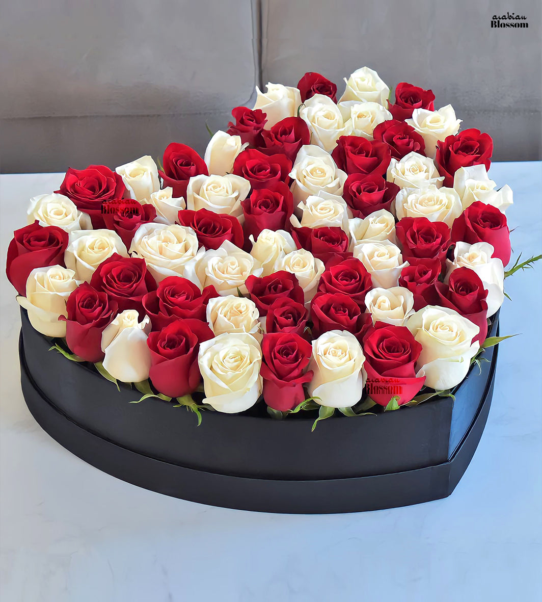 Arrangement of 30 stems of peach roses and 30 stems of red roses in a heart shape box