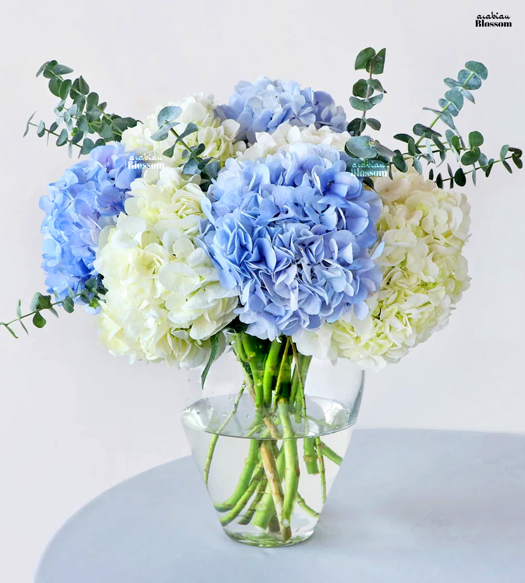 8-StemS White & Blue Hydrangeas in a Matka Vase for Weddings, Anniversaries & Luxury Décor