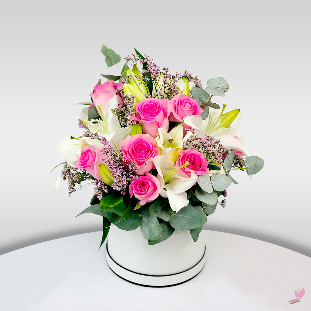 Experience timeless elegance with the Amazing Bloom bouquet, featuring a stunning arrangement of 10 stems of pink roses and 4 stems of white lilies, perfectly complemented by purple Limonium and eucalyptus leaves, all beautifully displayed in a white round box.