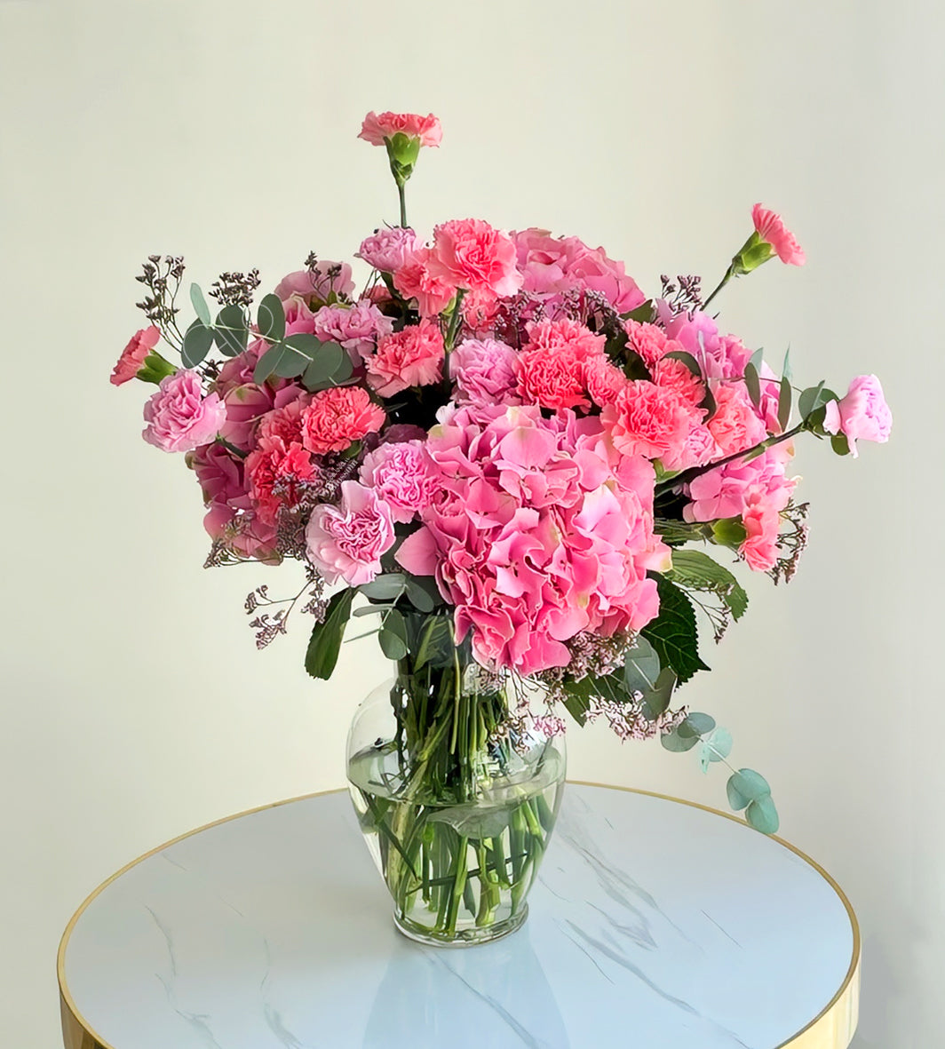 - Arrangement of 4 stems of pink hydrangeas and 40 stems of pink carnations with fillers in a matka vase