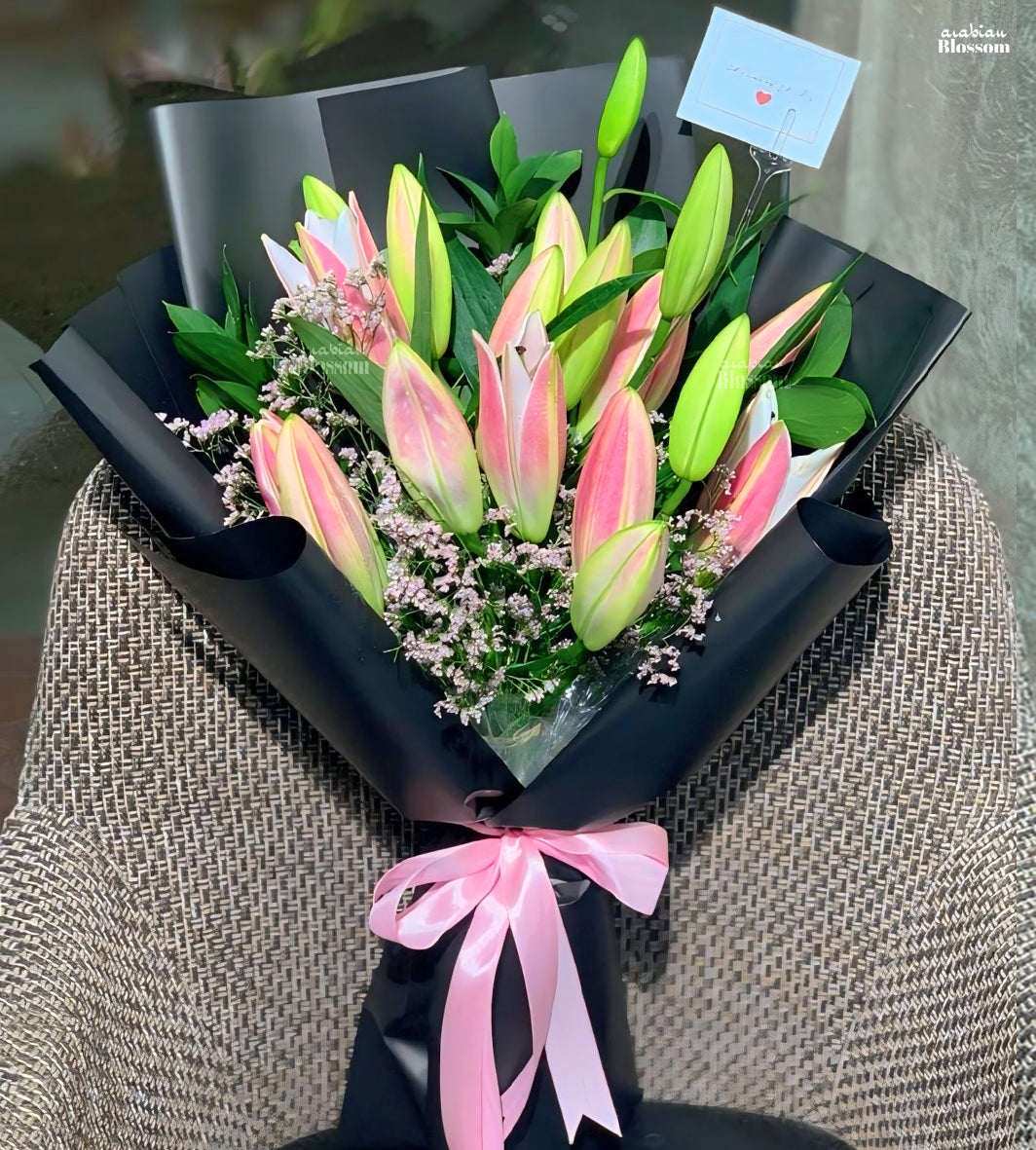 Bouquet of 5 Stems of Pink Lilies with fillers of limonium pink and Greens in a nice Black Wrapping.