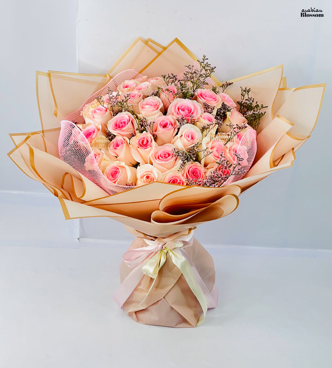 Bouquet of 30 stems of sweet revival pink roses with fillers of limonium pink nicely packed with net and wrapping paper