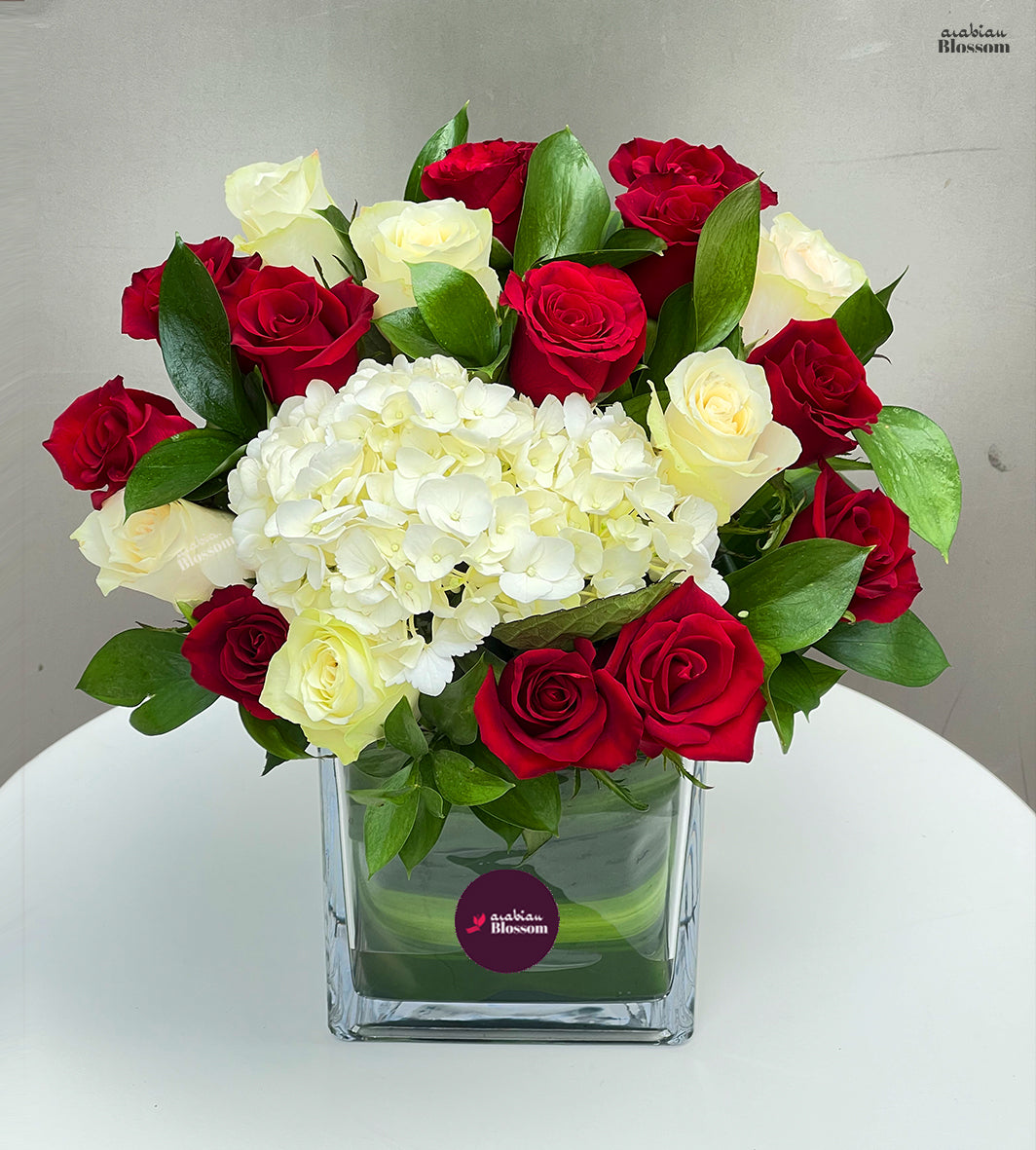 Arrangement of 10 stems of red roses 5 stems of white roses and 1 stem of white hydrangea with 3 stems of single ruscus in a cube vase