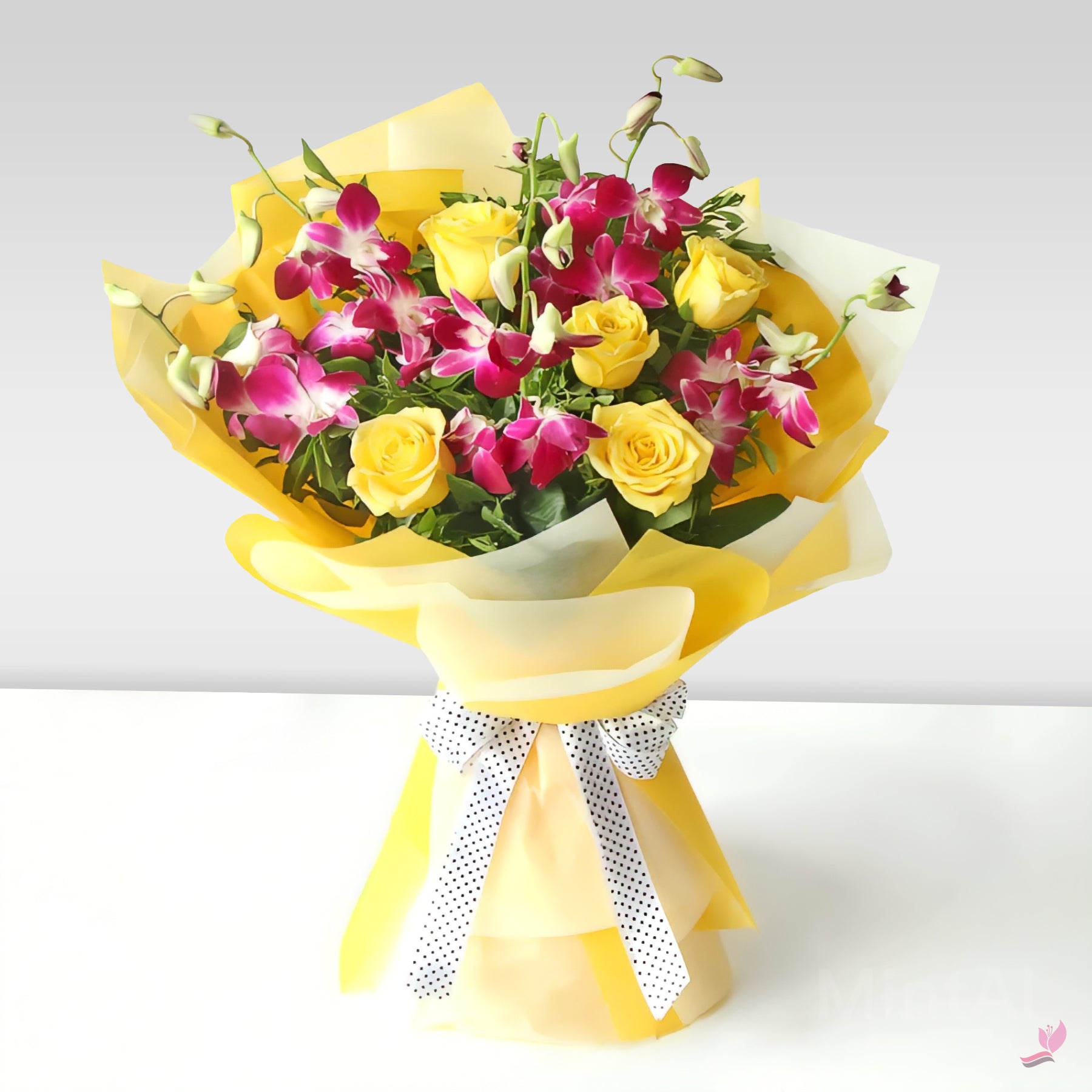 Bouquet of 5 stems of yellow rose and 5 stems of purple orchid in a yellow wrapping