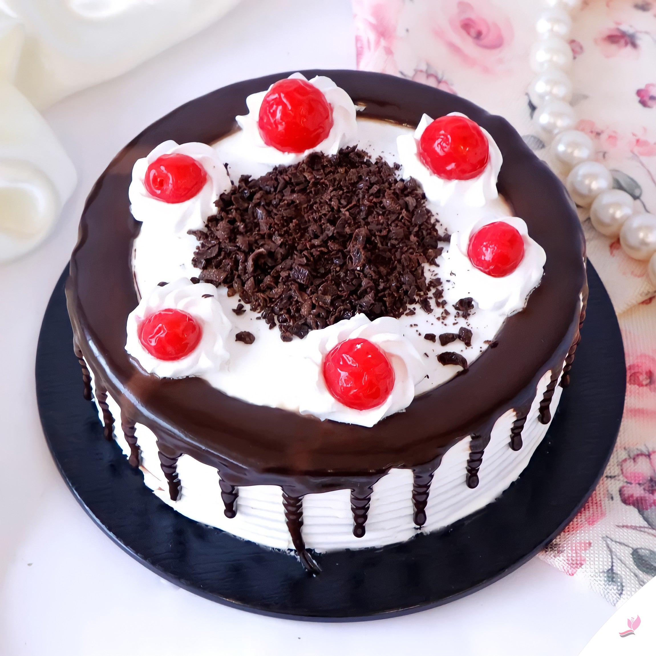 - Beautifully crafted with chocolate shavings and cherries
