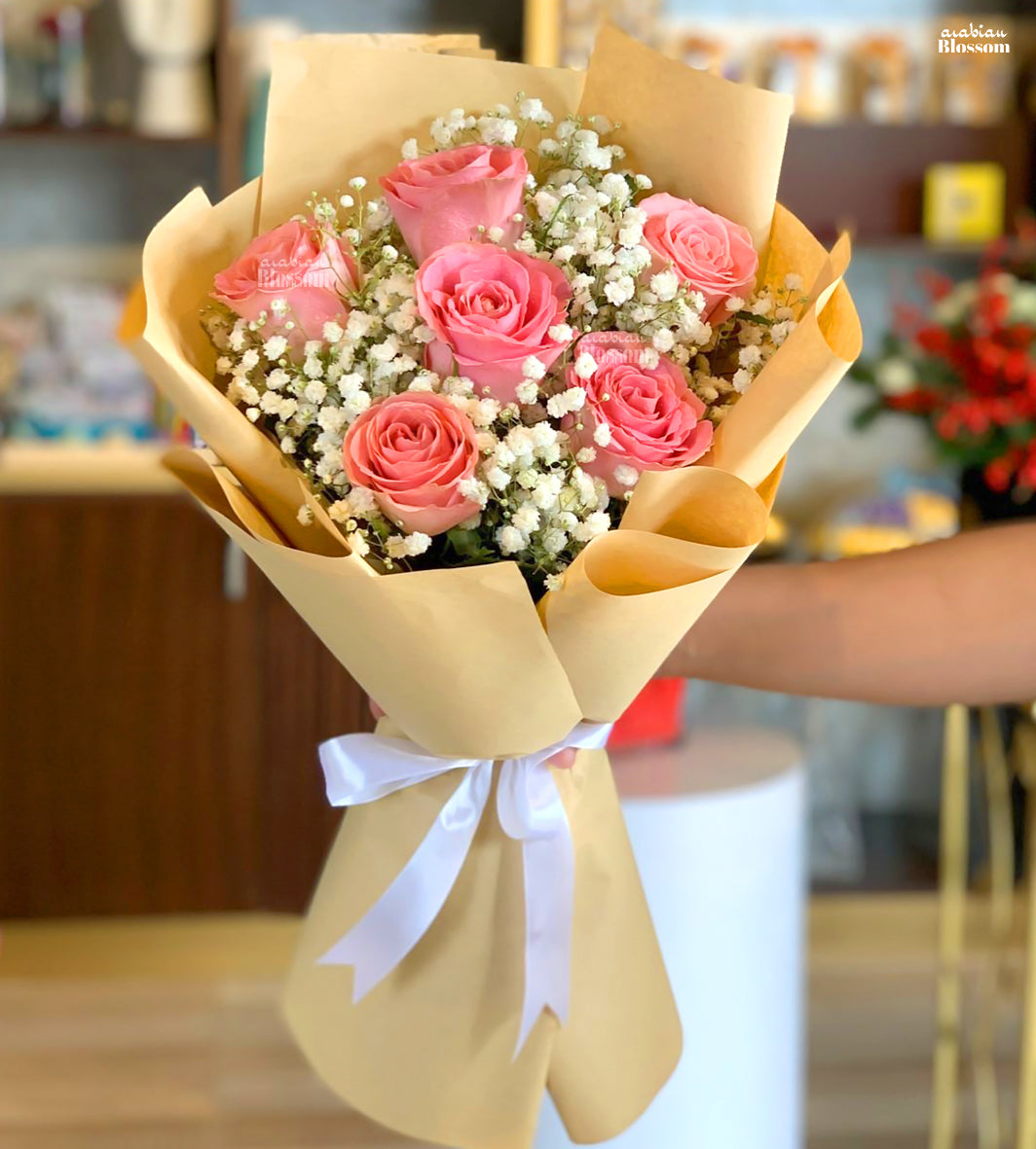 Bouquet of 6 stems of peach roses with fillers of Gypsophila in a nice brown wrapping