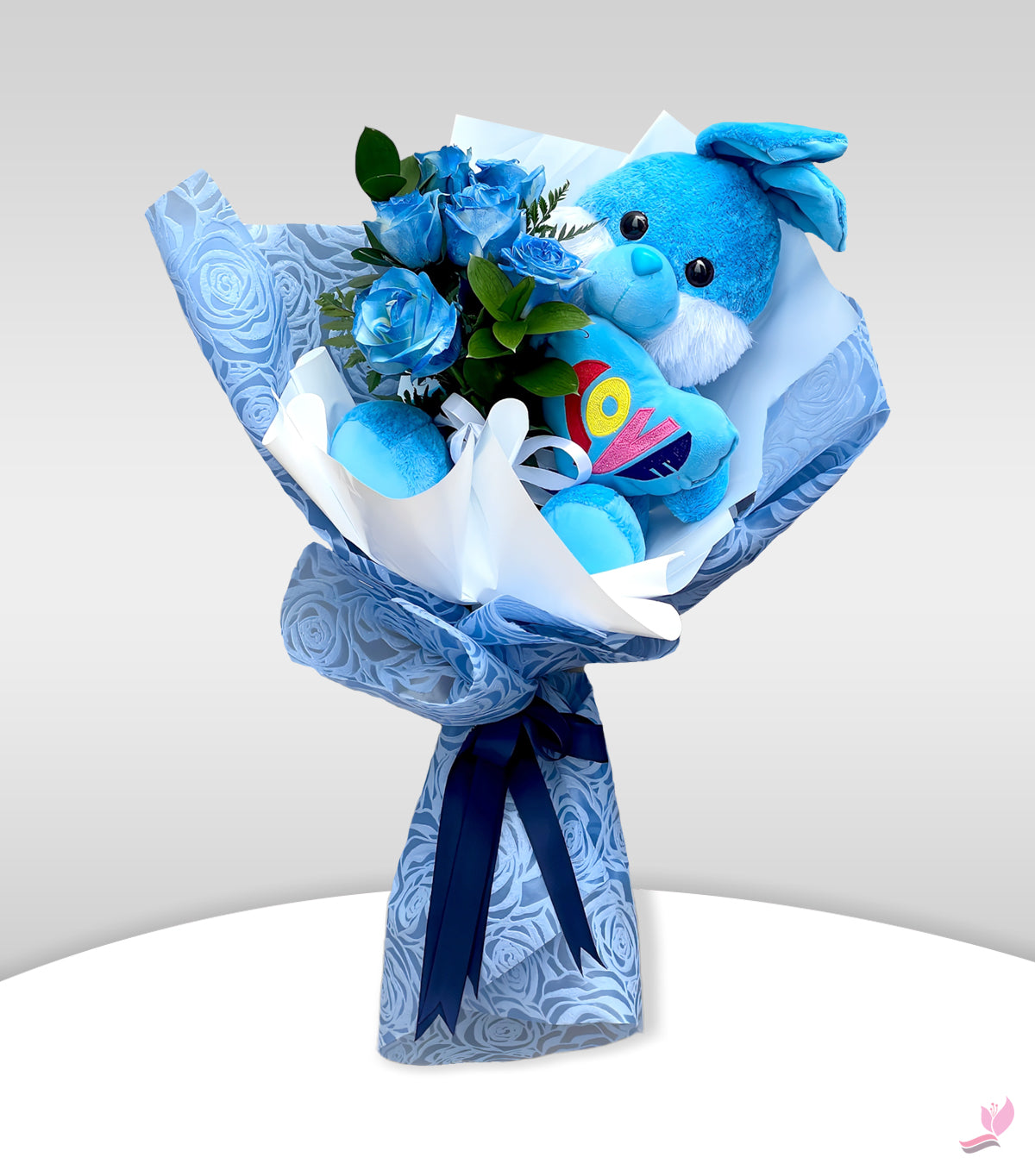 - A Cute Blue Teddy holding a Beautiful 6 Blue roses has been packed in a nice blue wrapping