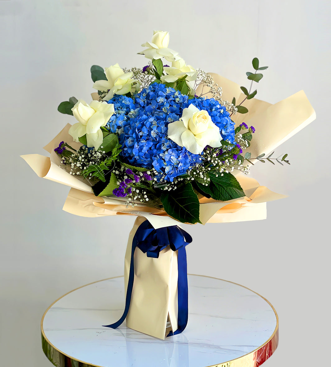 A bouquet of 5 stems of white roses and 4 stems of blue hydrangeas with fillers of Gypsophila and purple statice in a nice brown wrappingÂ