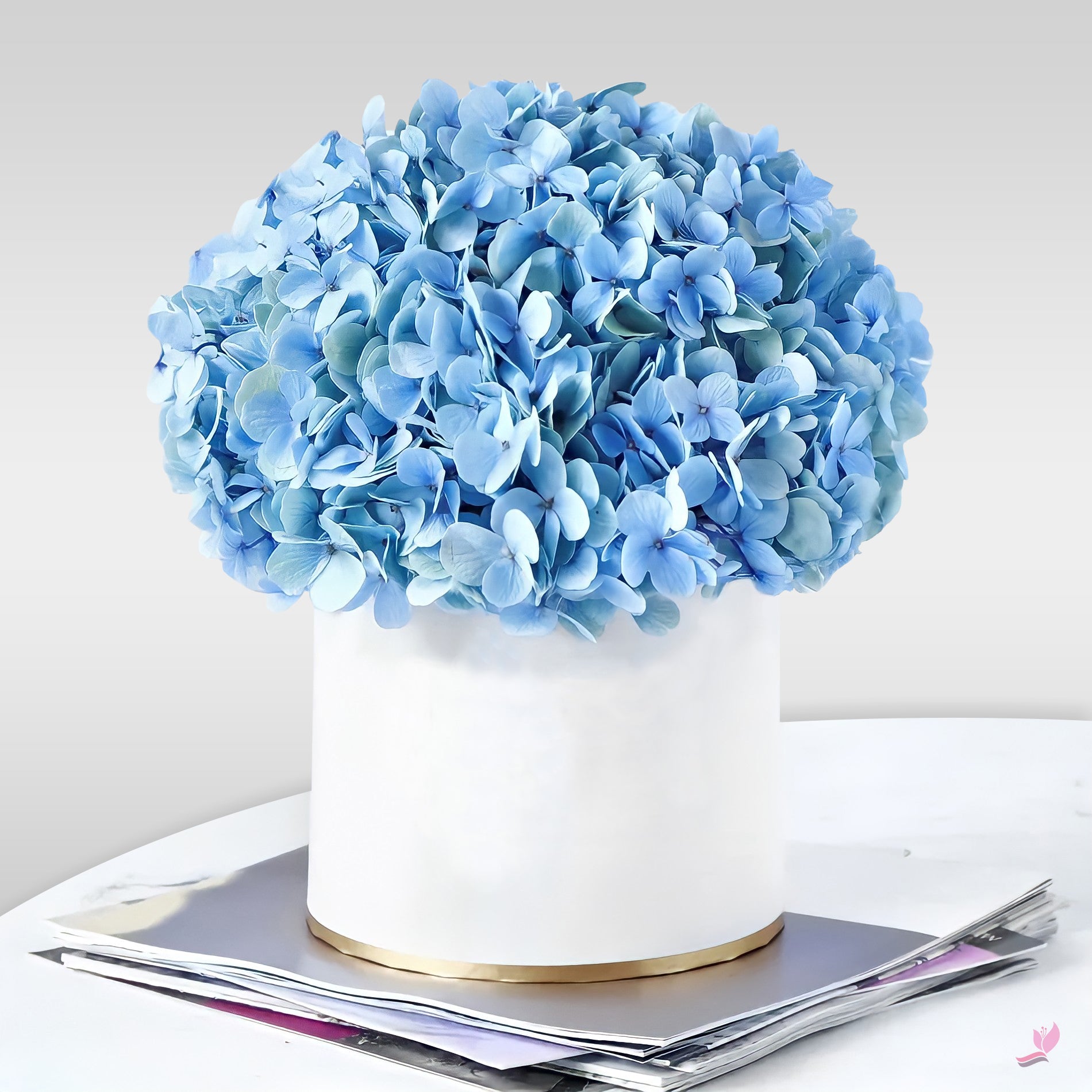 Arrangement of 3 stems of blue hydrangea with fillers in a small white round box