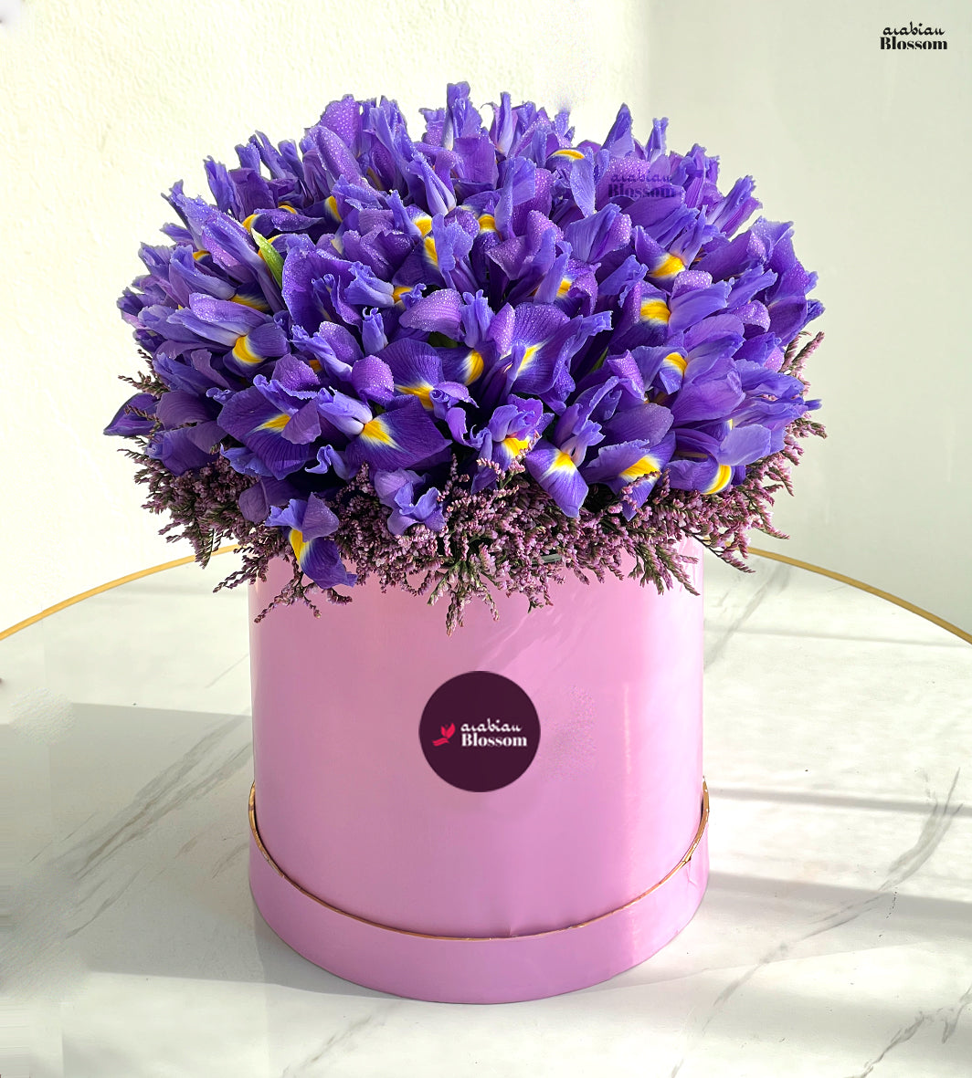 30 stems of Iris Blue with fillers of Limonium Pink in a Pink Box
