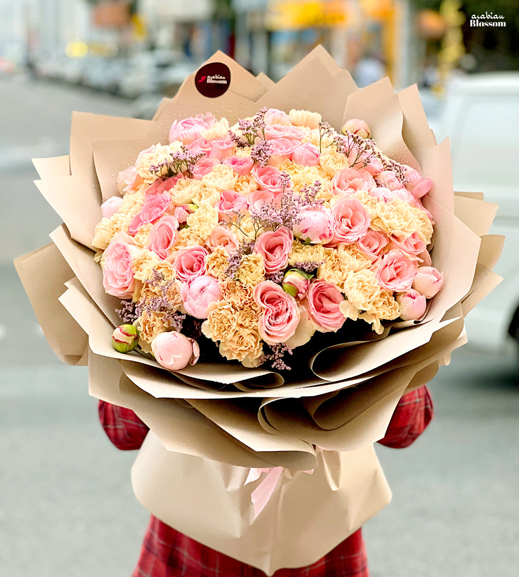 Bouquet of 20 stems of pink peonies and 80 stems of peach carnations with fillers in a nice wrapping