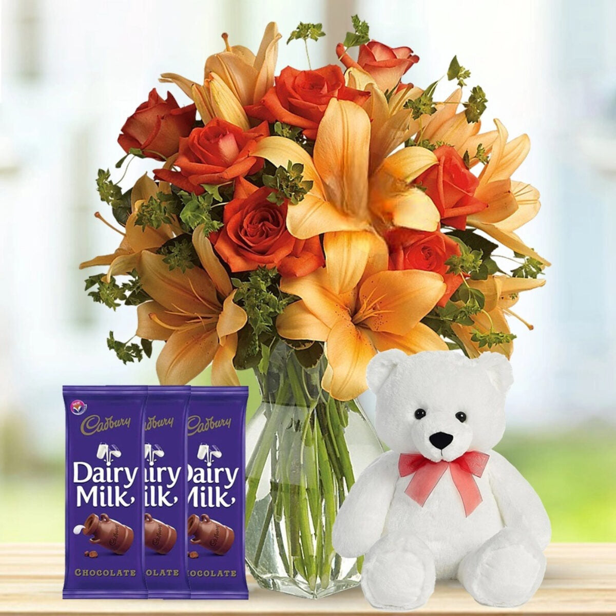 Arrangement of 4 stems of orange lilies 10 stems of orange roses with fillers in a matka glass vase with combo of 3pcs Dairy milk chocolate and 8 inch white teddy bear