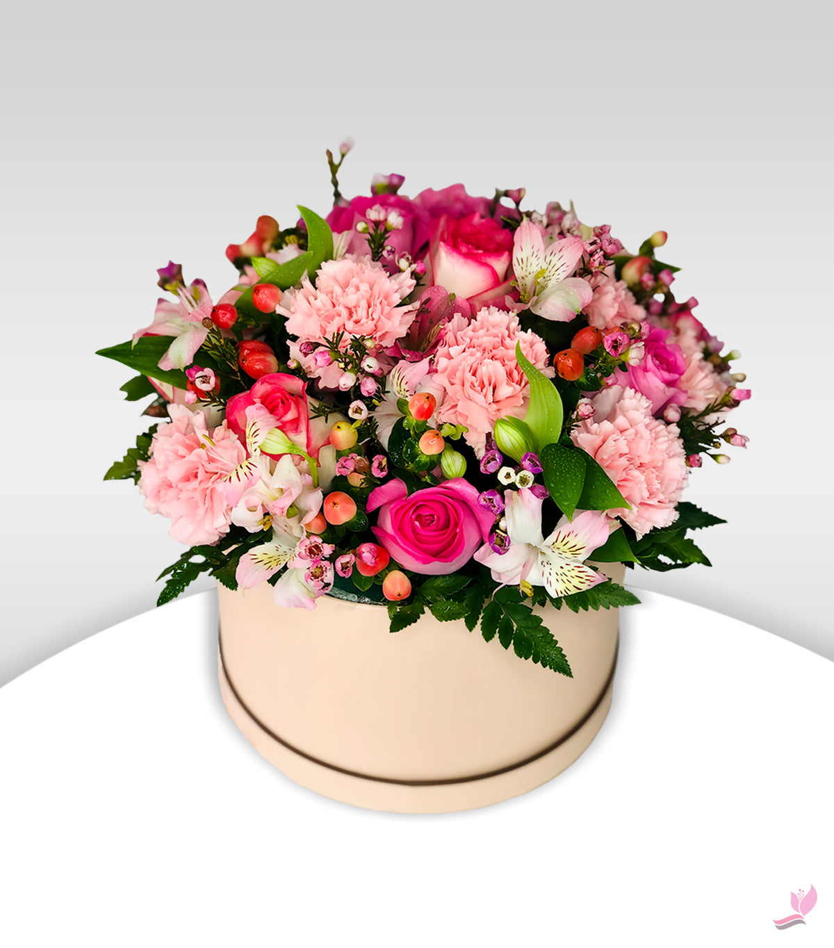 Box arrangement of pink carnation double toned pink roses, pink Alstroemeria, red hypericum with fillers of pink vax in a round box