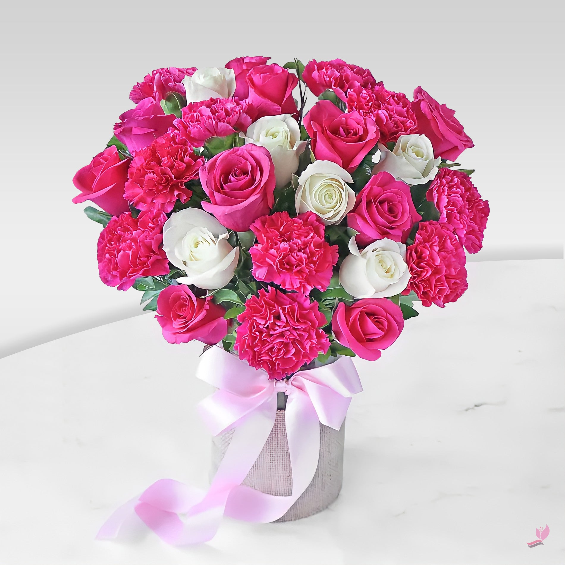 - Arrangement fuchsia pink Carnations, fuchsia pink roses, and white roses in a Glass Vase