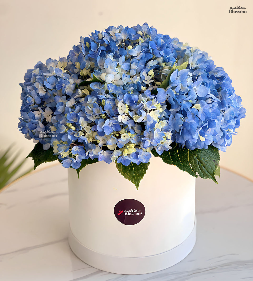 - Arrangement of 6 stems of Blue Hydrangeas in a white box