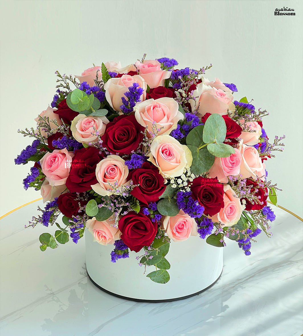 - Arrangements of 40 red and pink with 10 stems of purple statics with fillers in a white box