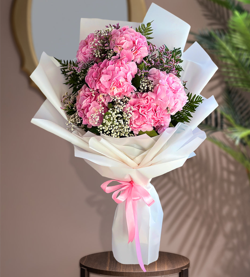 - Bouquet of 6 stems of pink hydrangeas hand tied in a nice white wrapping with fillers and greens