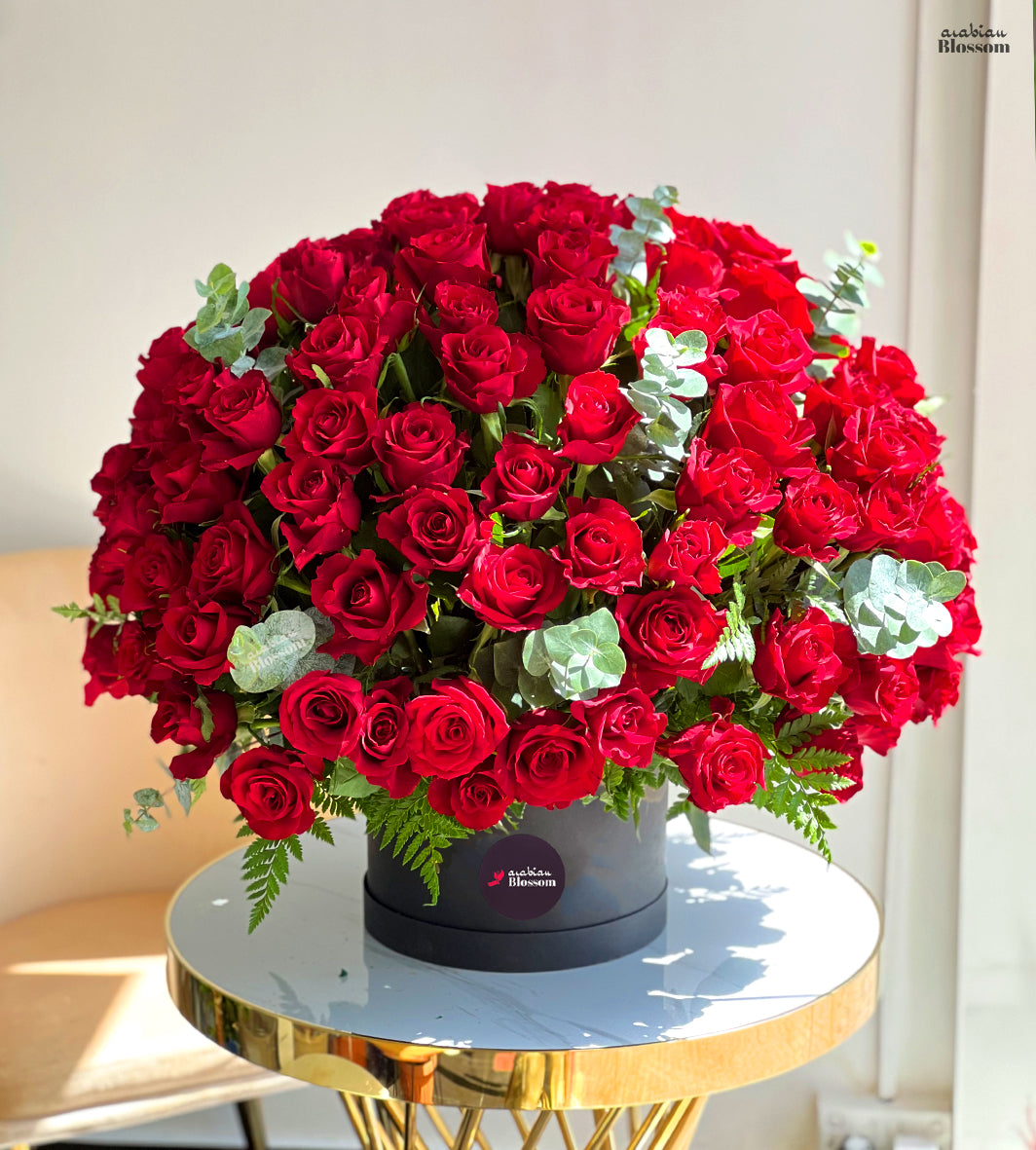 Arrangement of 100 stems of red roses with fillers of greens and eucalyptus leaves in a black box (one sided round arrangement)