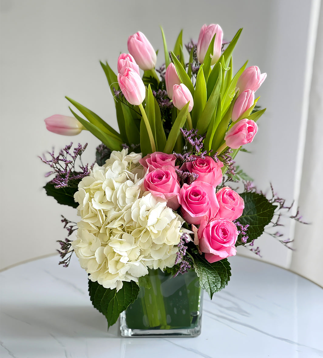 Arrangement of 10 stems of pink tulips, 1 stem of white hydrangeas and 6 stems of pink roses beautifully arranged in a square glass vase with fillers and greens