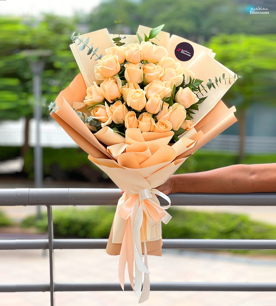 Peach Bliss Bloom – 20 Stems of Peach Roses with Green Fillers for Romantic Gestures & Celebrations