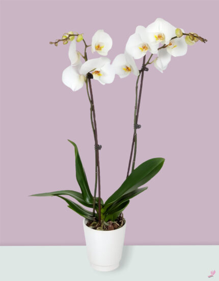 Double stem purple orchid plant in a white pot