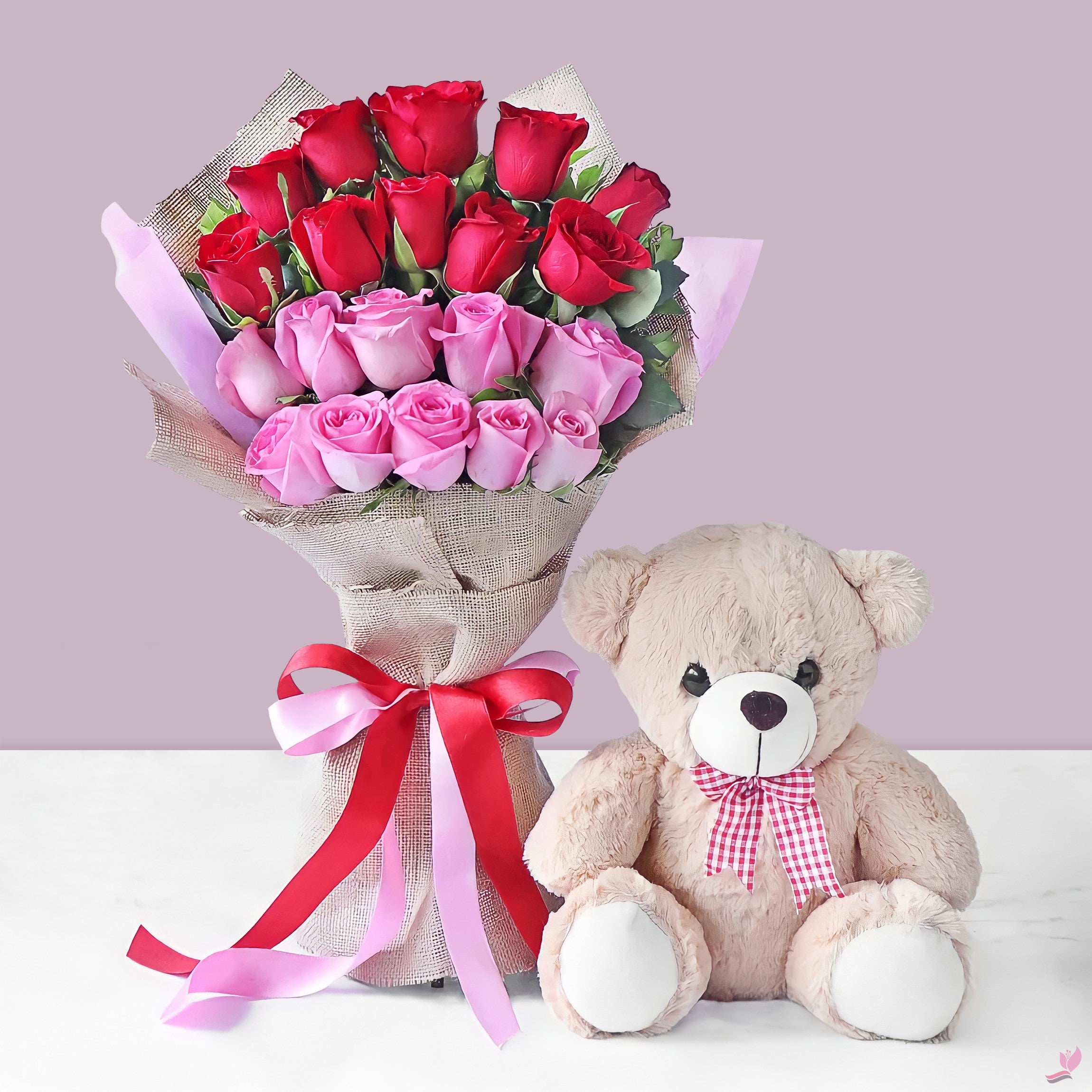 Red & Pink Roses with Teddy Bear Combo in Jute & Paper Wrapping for Romantic Gifting