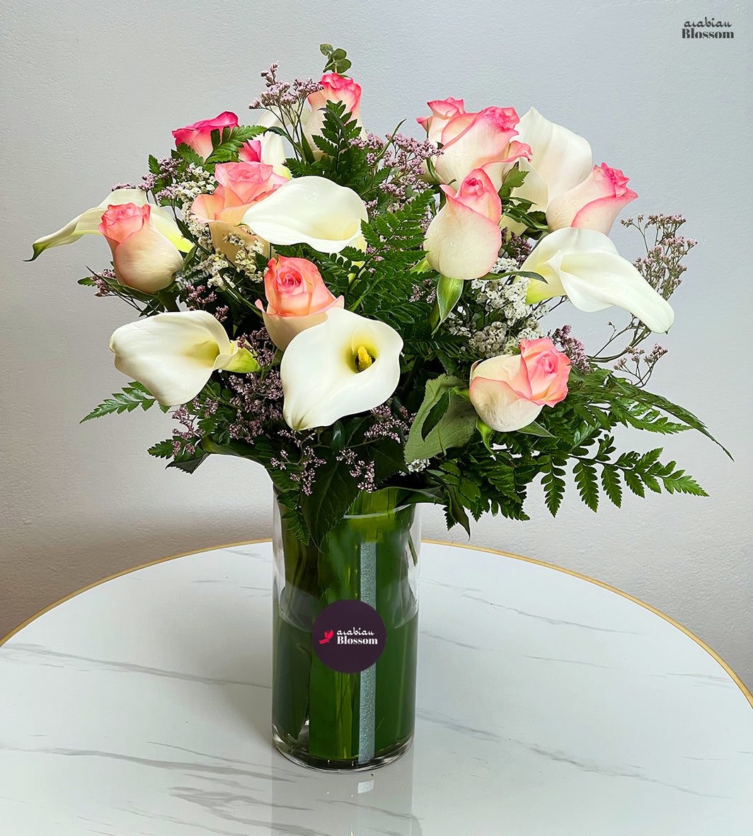 Roses & Calla Lilies Bloom with Green Fillers & Pink Limonium for Elegant Gifting