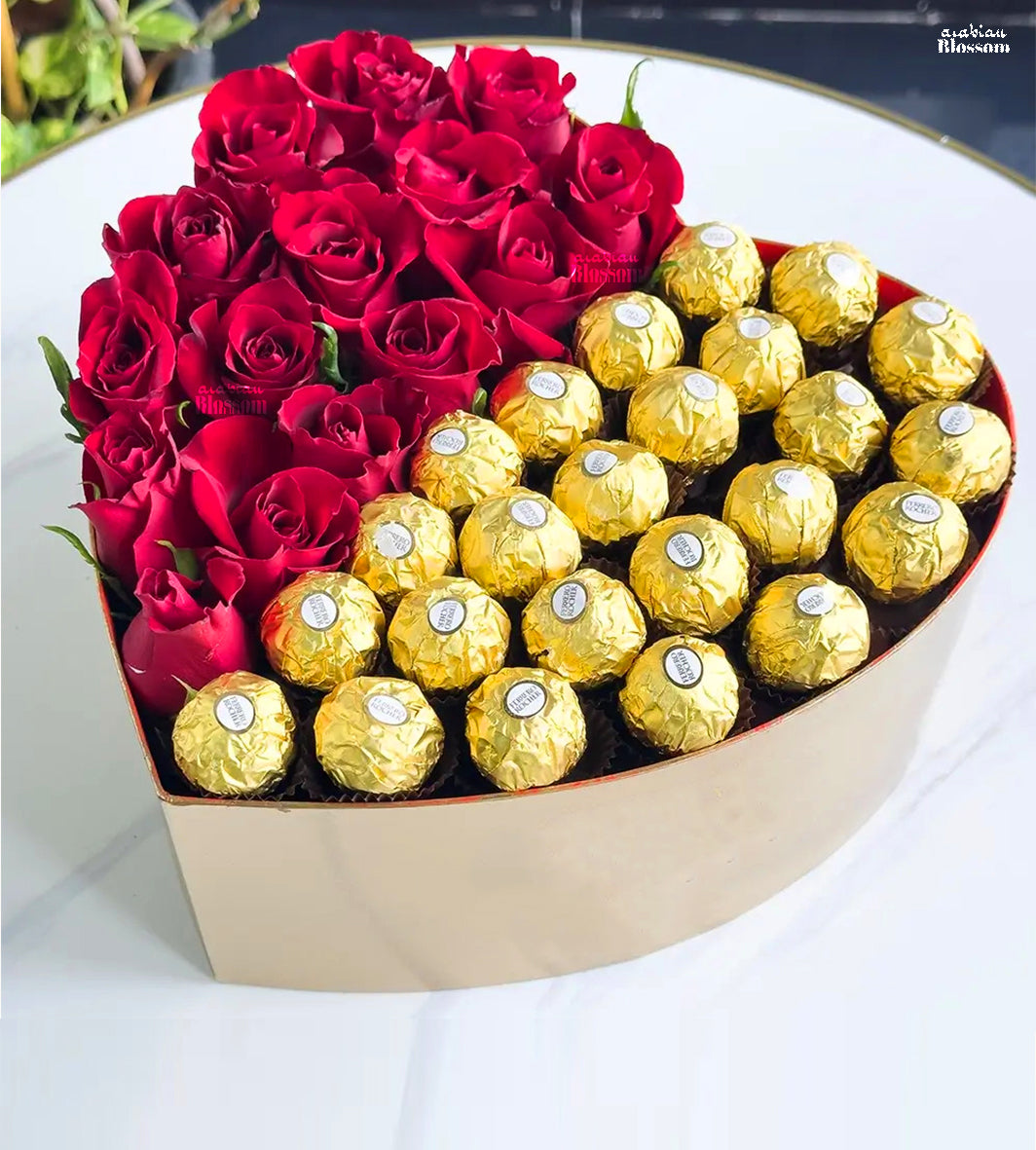 Roses & Ferrero Rocher Heart Arrangement – 16 Red Roses with 24 Chocolates for Romantic Gifting