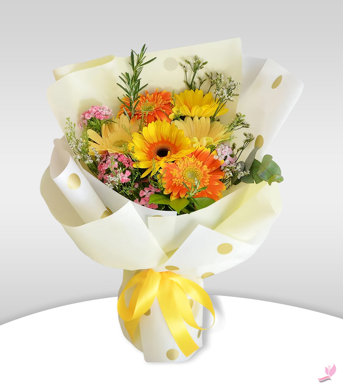Seasonal Sunshine Bouquet – Orange & Yellow Gerberas with Pink Wax Flower Fillers for Cheerful Gifting