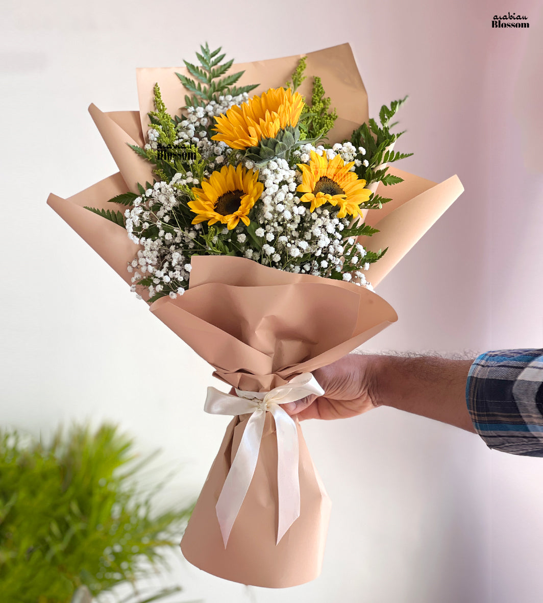 Sunshine Love – 3 Sunflowers Bouquet with Gypsophila & Greens