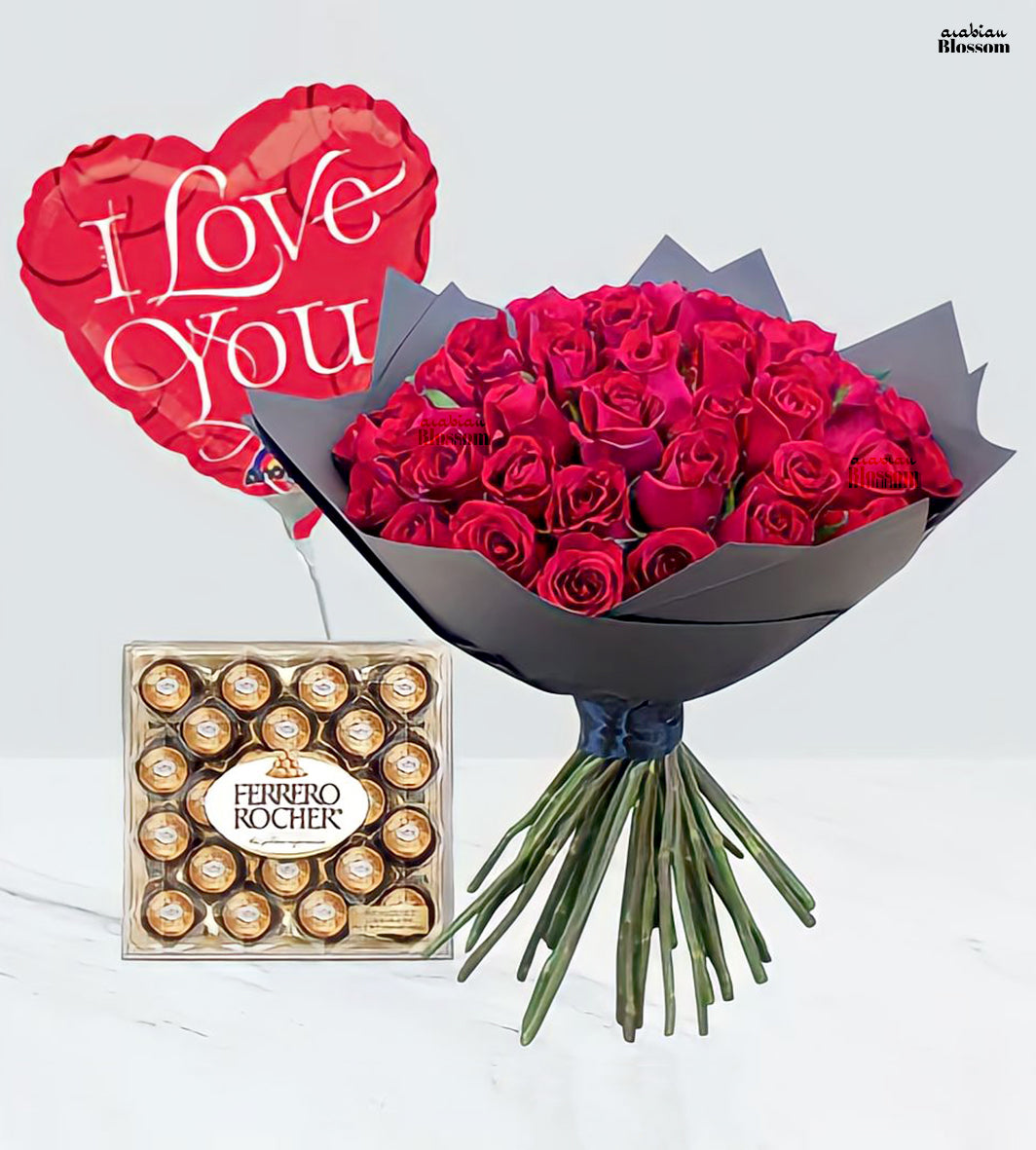 Bouquet of 30 stems of red roses with fillers in a nice wrapping 24pcs Ferrero Rocher chocolate and 1pcs I love you Balloon