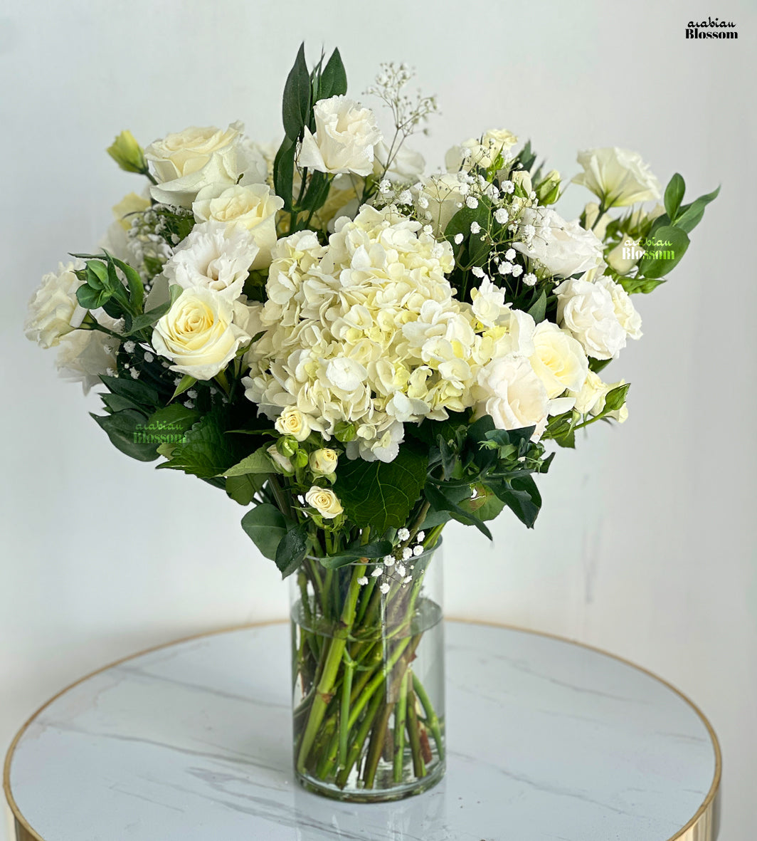 White Flowers Vase – Hydrangea, Roses, Lisianthus & Gypsophila for Weddings, Sympathy & Elegant Décor