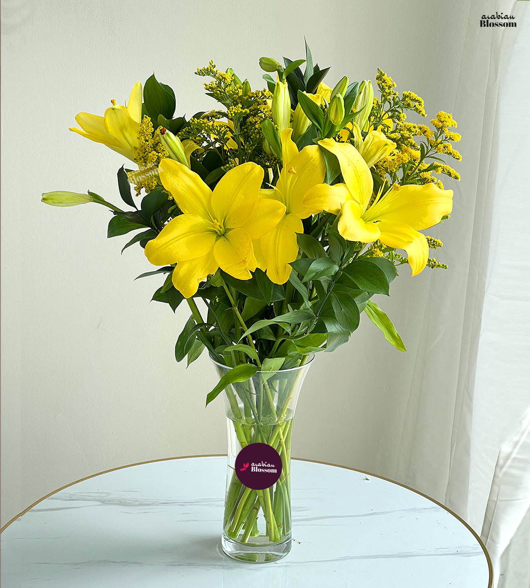 Bunch of 5 stems of Yellow Lilies with Fillers of Solidaster in a Vase