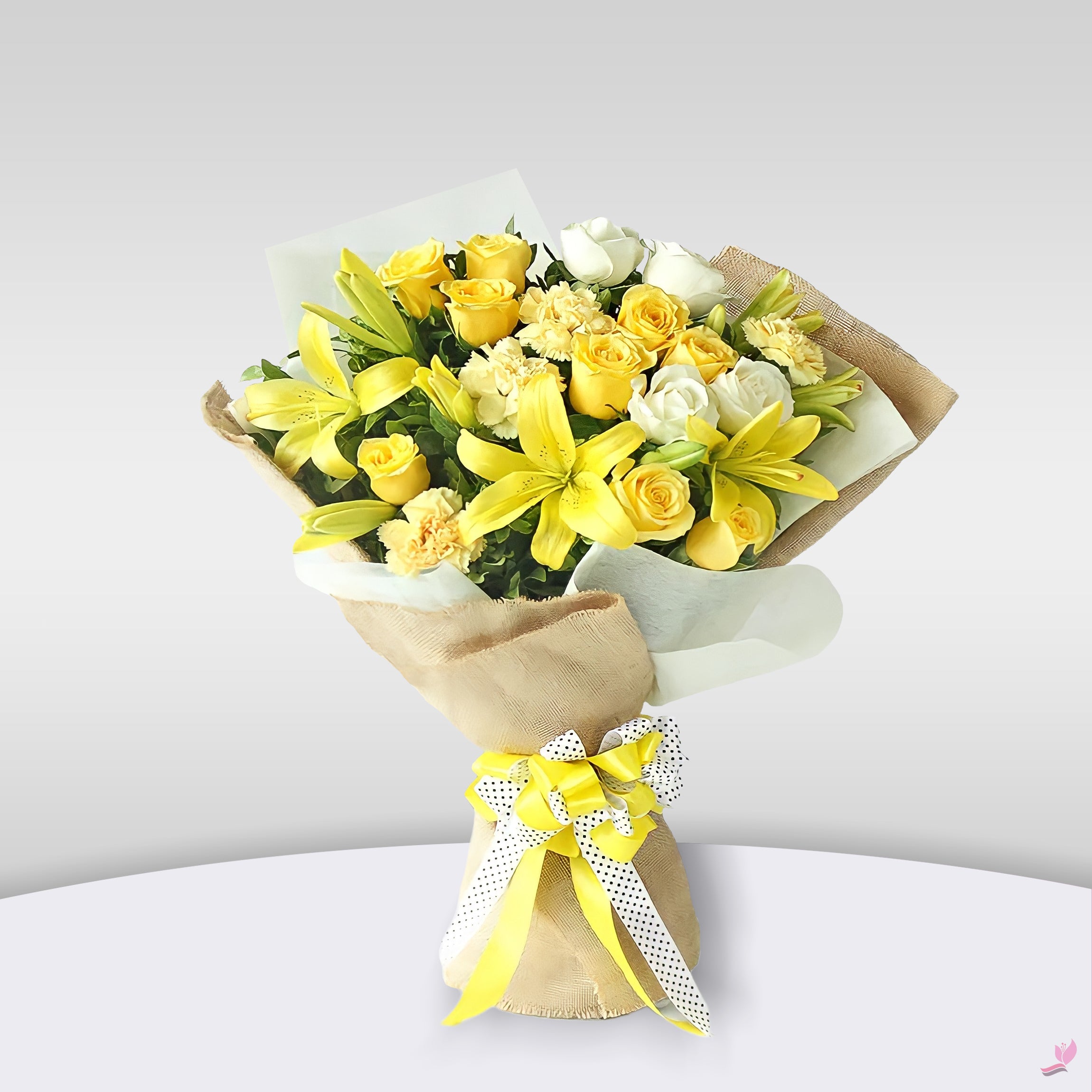 - Bouquet of Yellow Lilies, Yellow Roses, Peach Carnations, and White Roses perfectly tide and packed with Natural Jute and White Wrapping paper